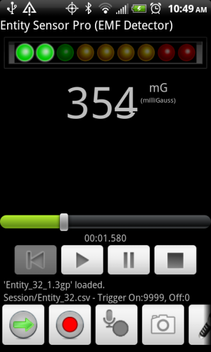 This allows you to take pictures from the Entity Sensor Pro app without having to leave to run the camera app. After purchasing the option, new Camera and Flashlight buttons are added to the main screen. The button area scrolls left and right if all of the buttons aren't displayed on the screen. Pressing the Flashlight button will toggle the LED camera flash on and off. This is not enabled while in camera mode. (At this time, the flashlight button will not work on all devices.) The camera button toggles the camera preview, which removes the bottom row of buttons, and the X, Y and Z readings from the screen, and shows the camera preview. (See figure 2). To take a picture, press the Snapshot button in the middle of the screen. A picture will be taken and saved to the current session folder, sequentially numbered. Pressing the Camera button again will close the camera preview, and return to screen to normal. The EVP Playback controls will be displayed after recording the first EVP for a session. If you toggle the EVP recording button , the EVP playback controls will be displayed. This will let you play back the last recorded EVP, even while continuing to record the next EVP.The main Entity Sensor Pro screen with the Media Enhancement buttons: